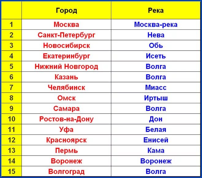 Исток и Устье рек России таблица.