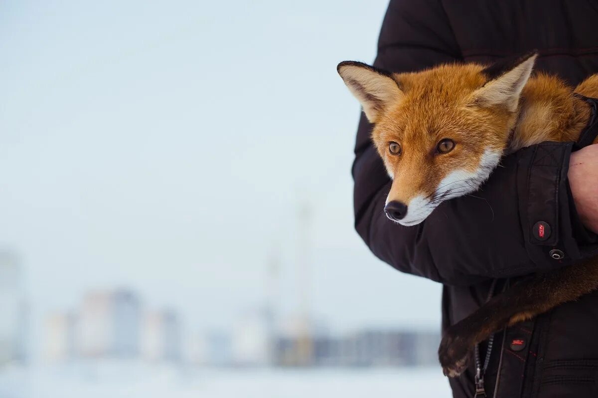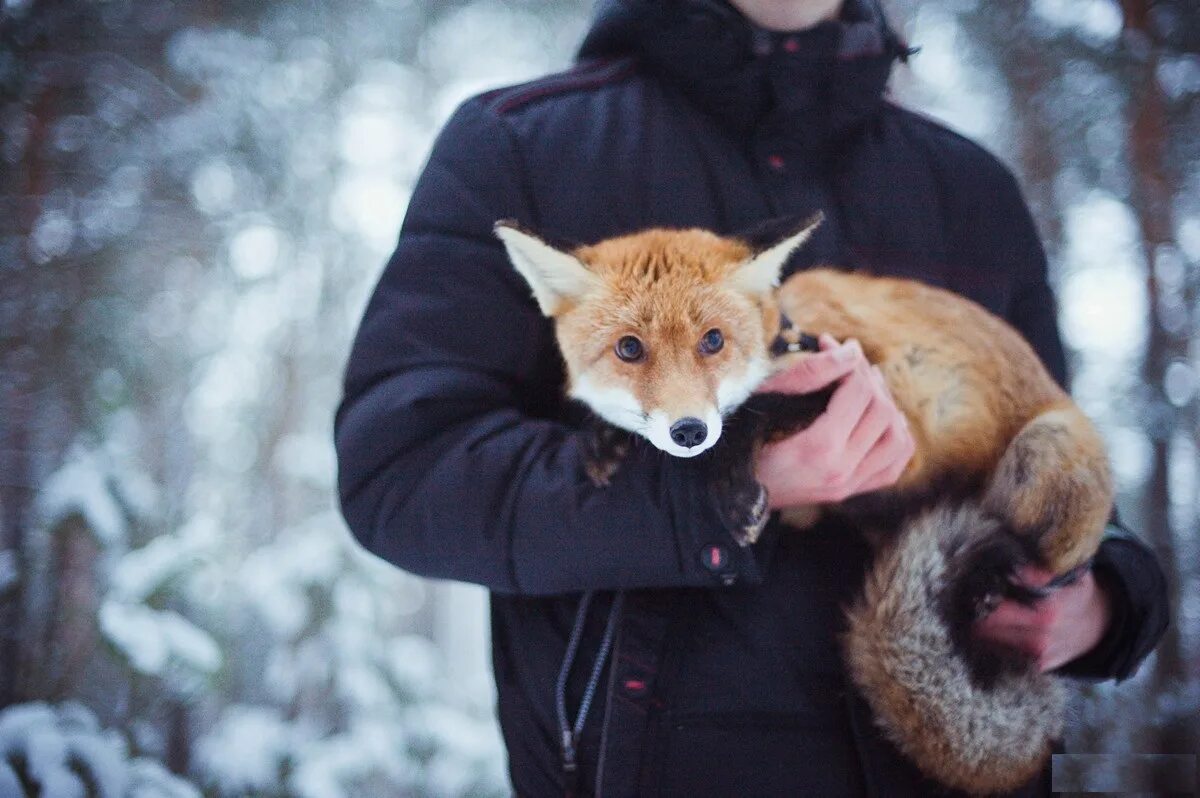 Лис обнимает человека.