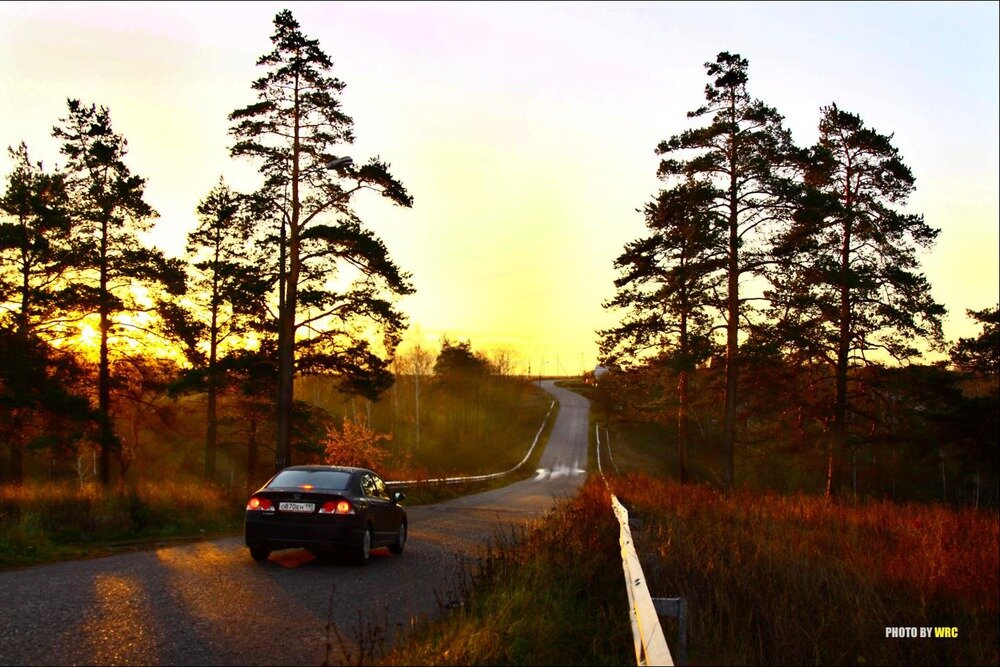 Закат дорога машина.