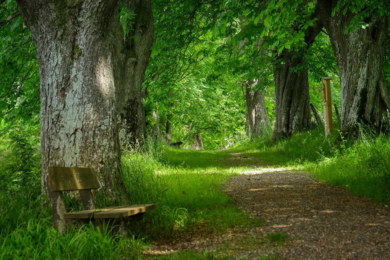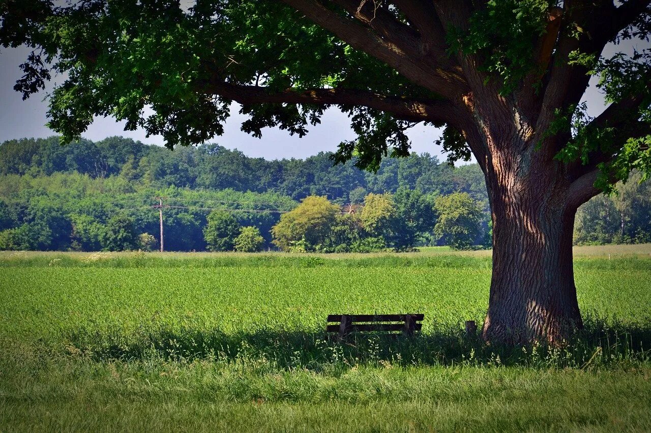 Скамья под деревом в саду.