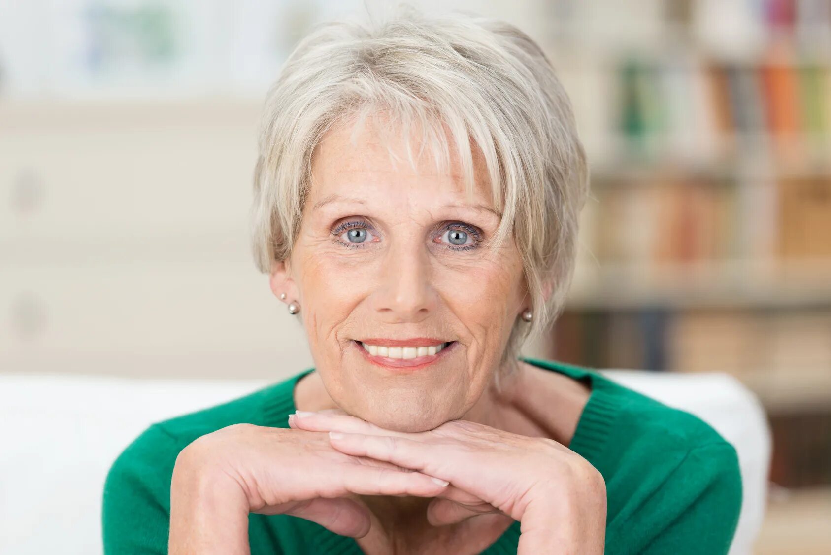 Пожилая женщина улыбается.