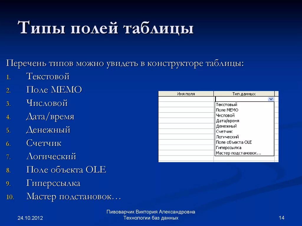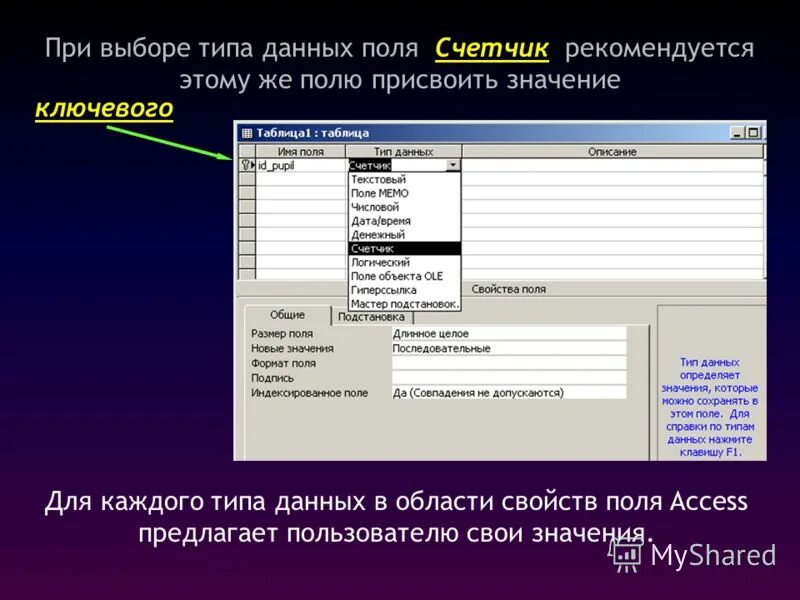 Поле таблицы типы данных поля свойства поля.
