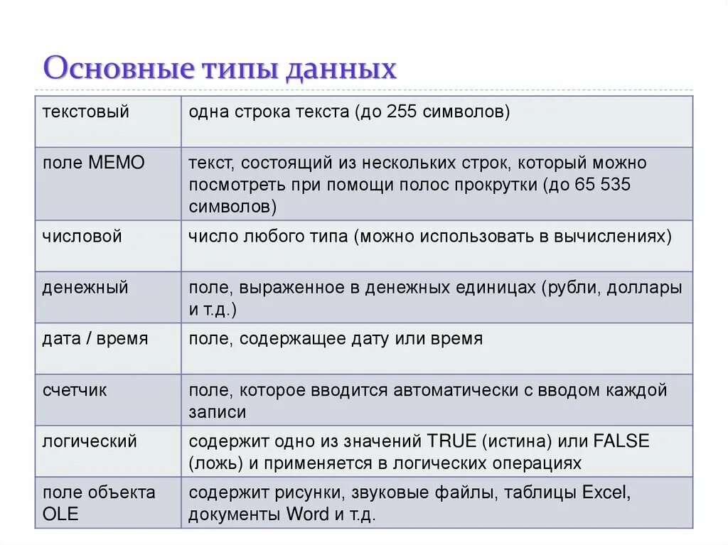 Типы данных полей таблицы.
