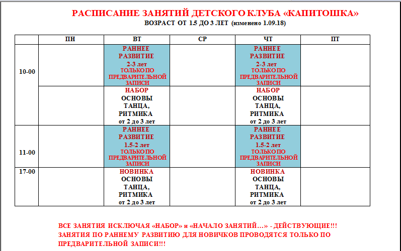 Расписание занятий в детском клубе.