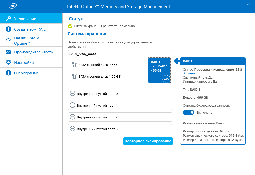 Ребилд Raid 1 Intel Rapid Storage.