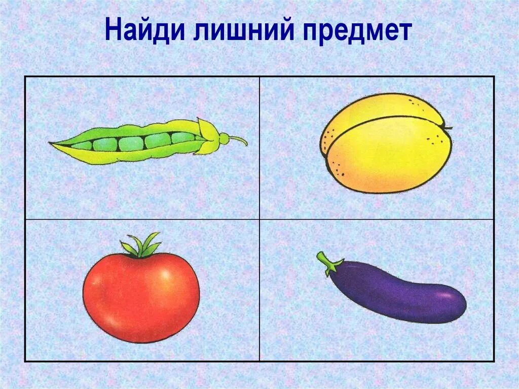 Четвертый лишний для детей фрукты овощи.