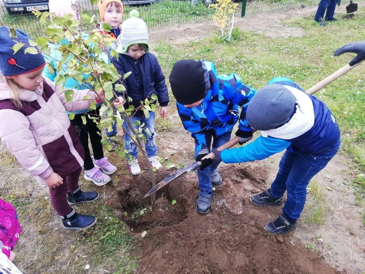 Высадка саженцев деревьев детьми.