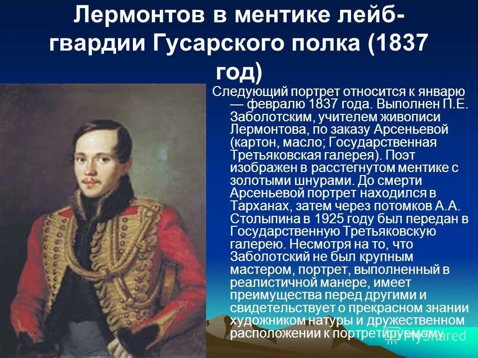 Лермонтов в вицмундире лейб-гвардии гусарского полка 1834.