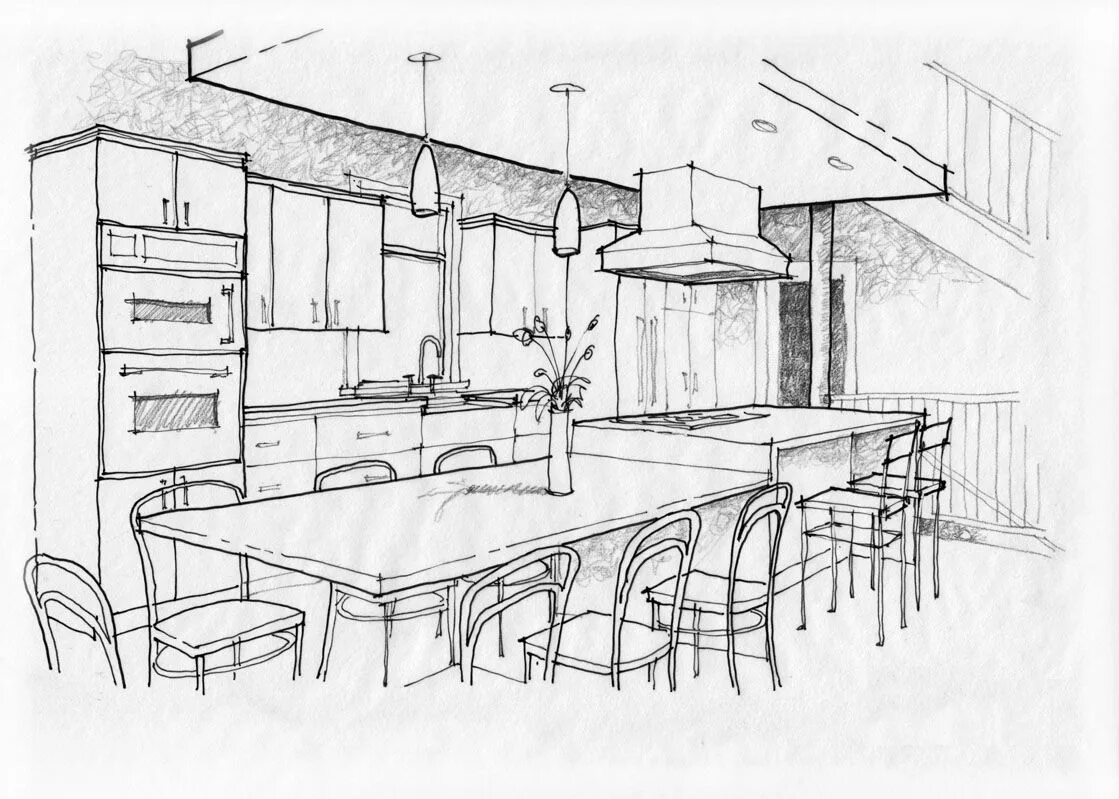 Интерьер кухни карандашом.