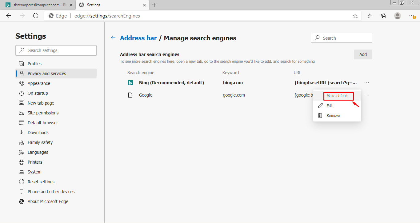 How to change default search engine Edge.