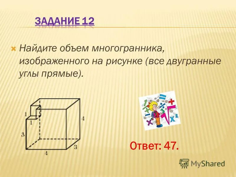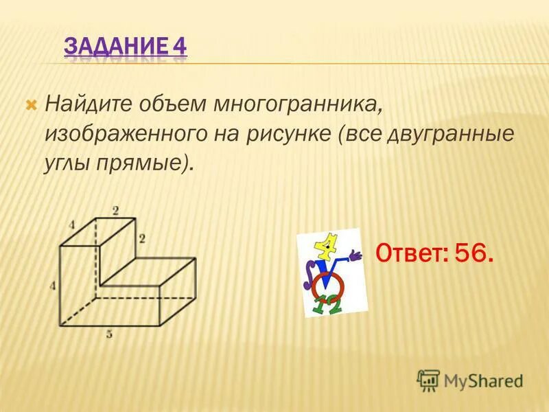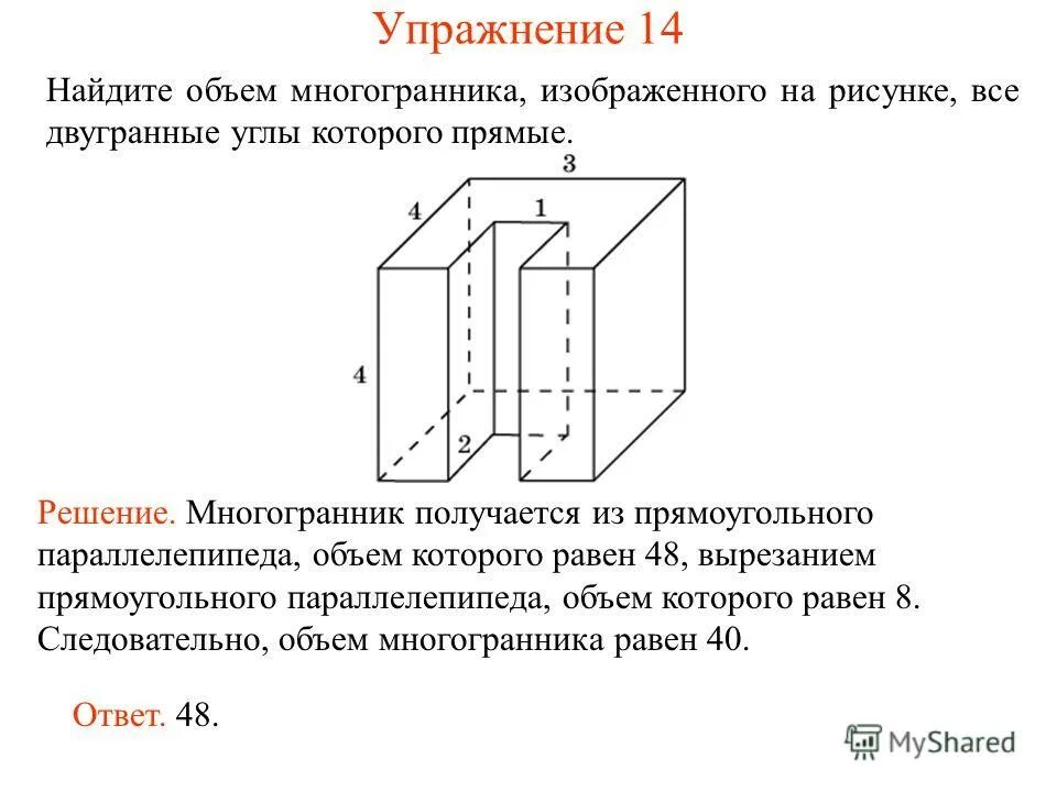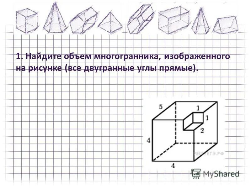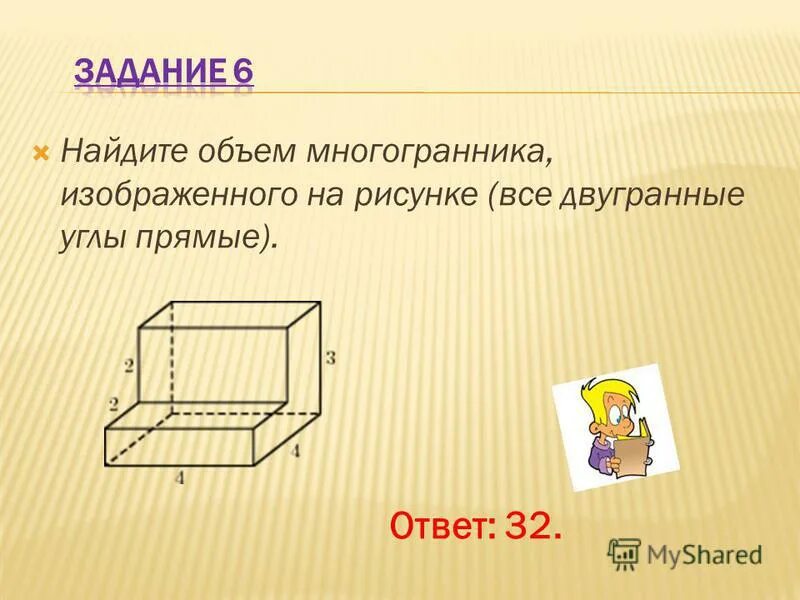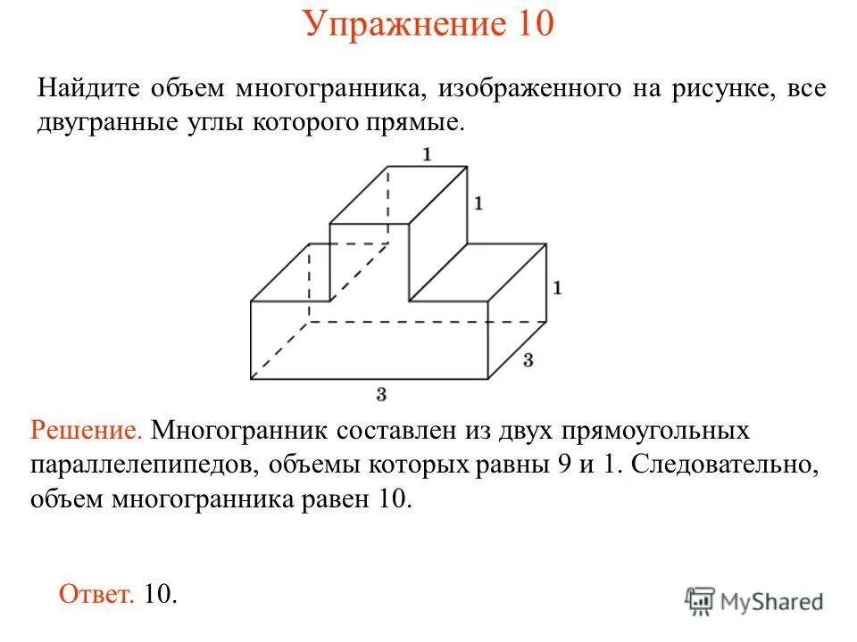 Найти объем многогранника все двугранные углы прямые.
