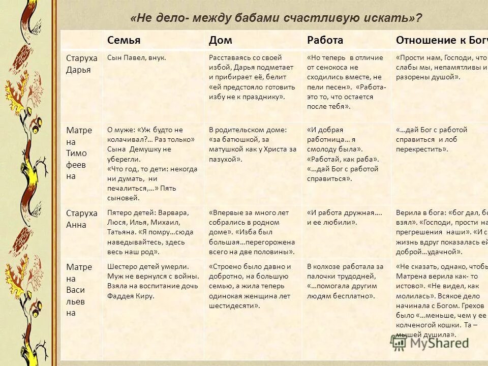 Характеристика образа Матрены Тимофеевны.