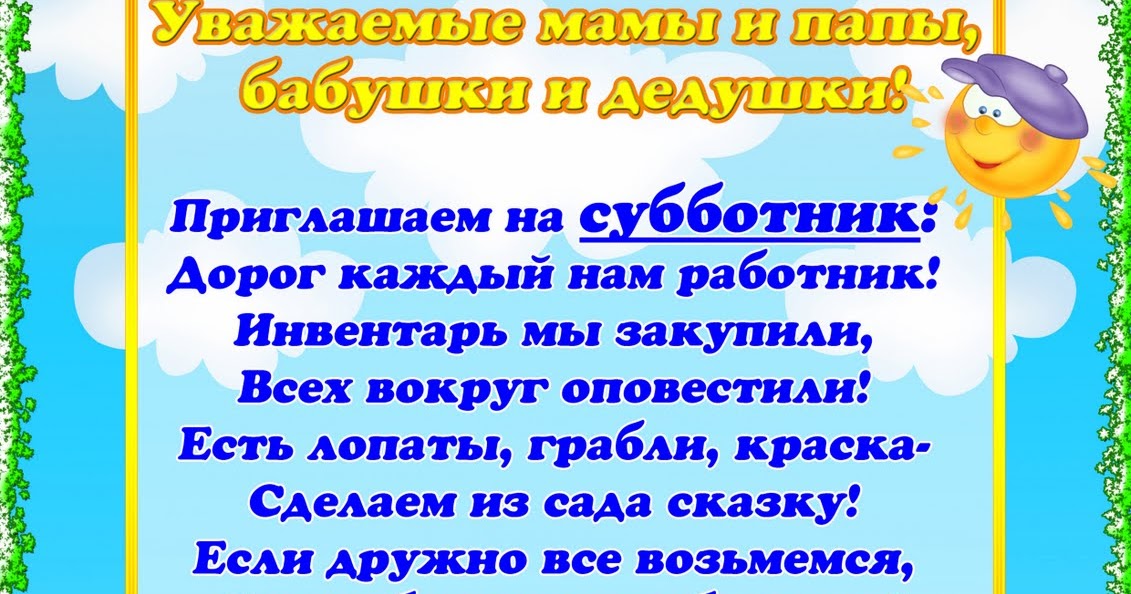 Объявление о субботнике в детском саду для родителей.