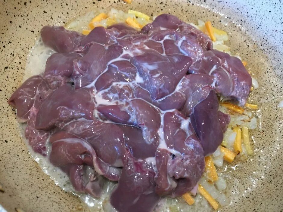 Куриная печень тушеная в сметане с луком.
