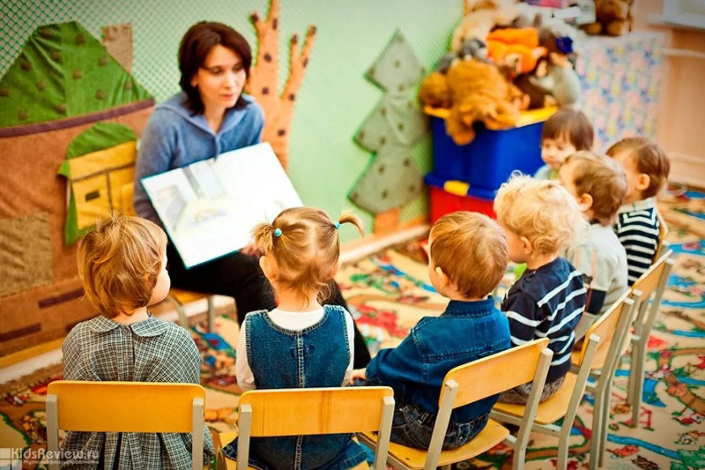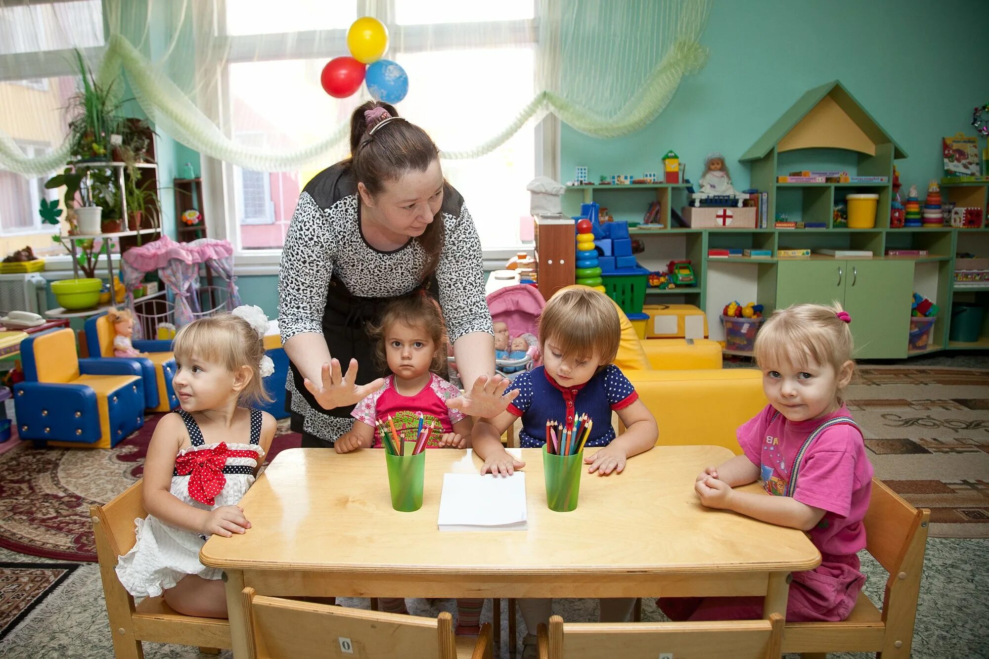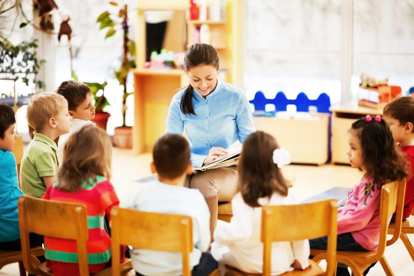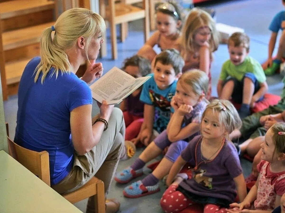 Воспитатель и дети в детском саду.