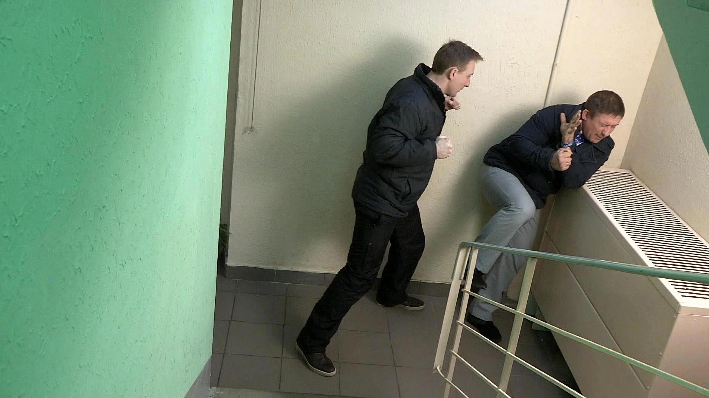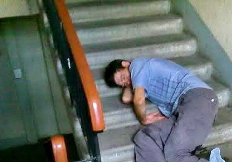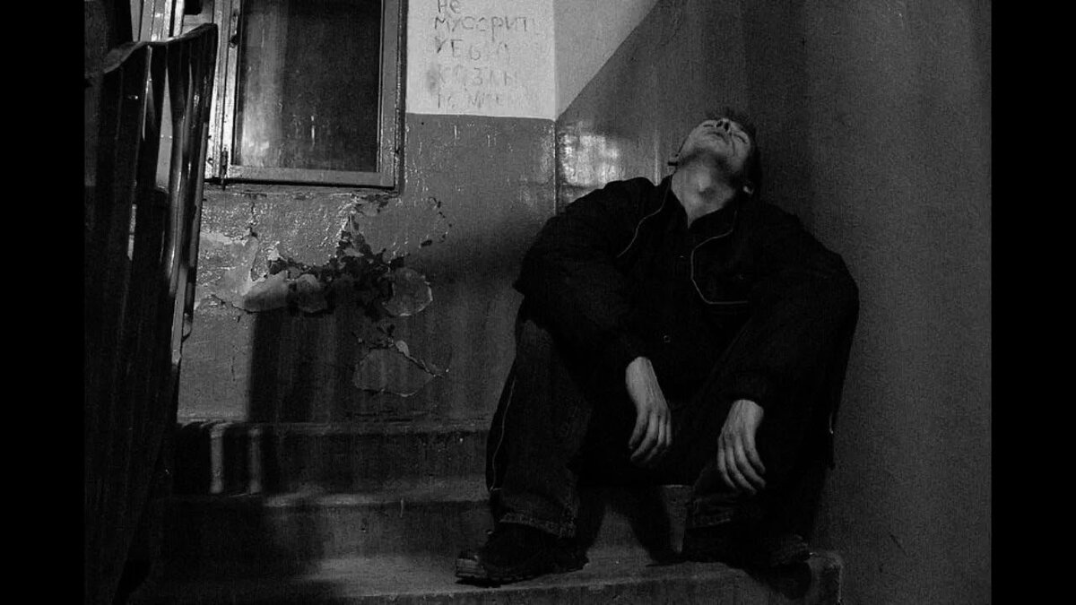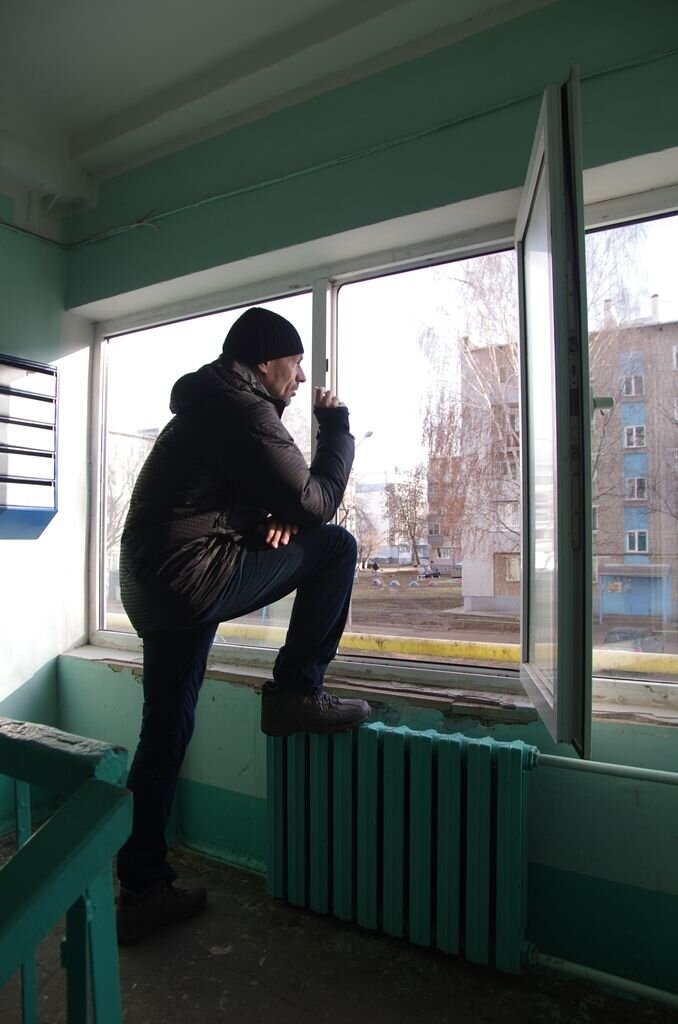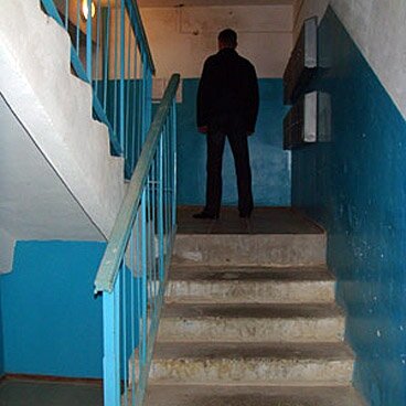 Мужчина сидит в подъезде.