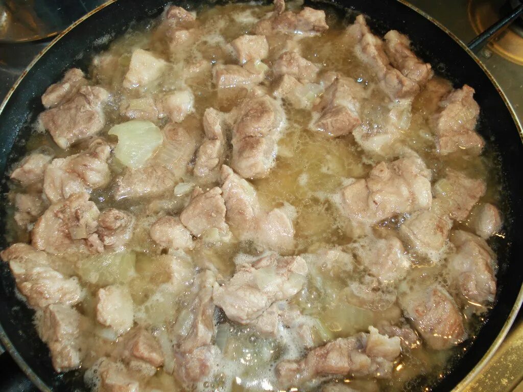 Мясо с луком на сковороде в собственном соку.