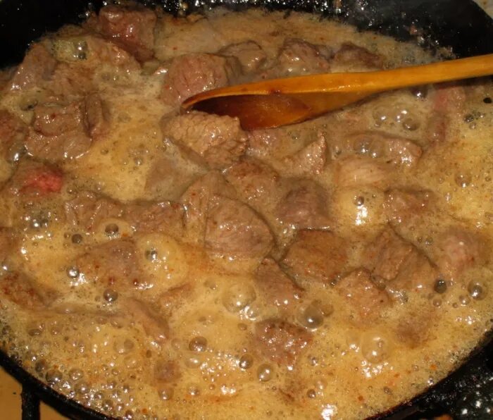 Гуляш из сердца говяжьего с подливкой в сковороде.