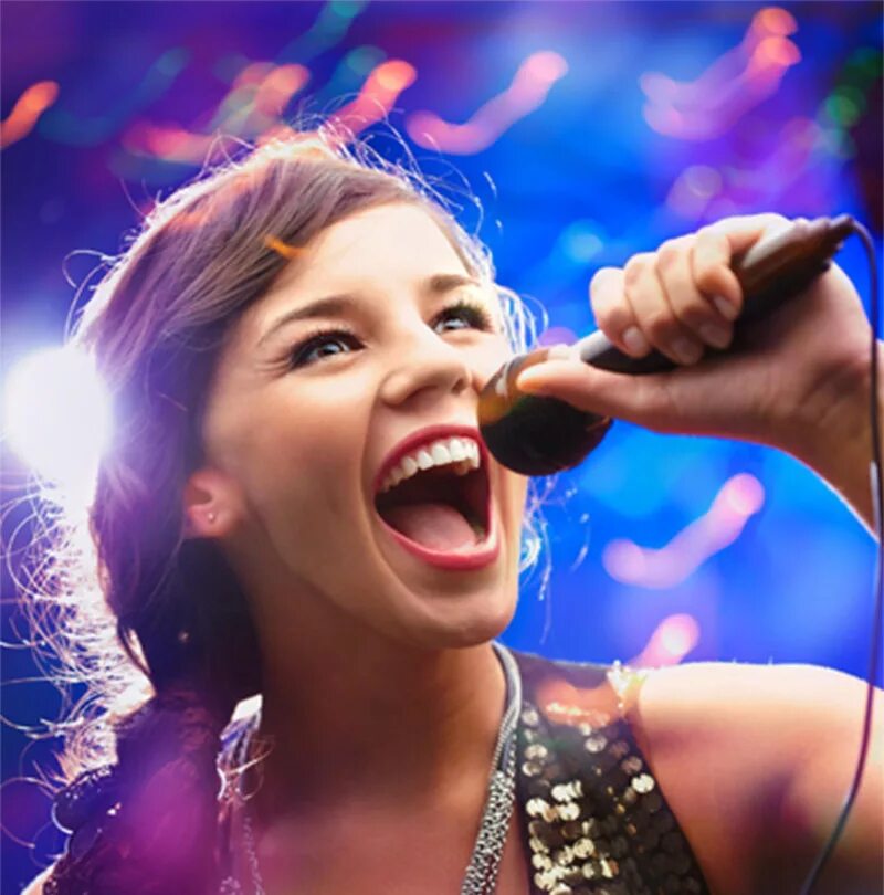 Девушка поет в микрофон.