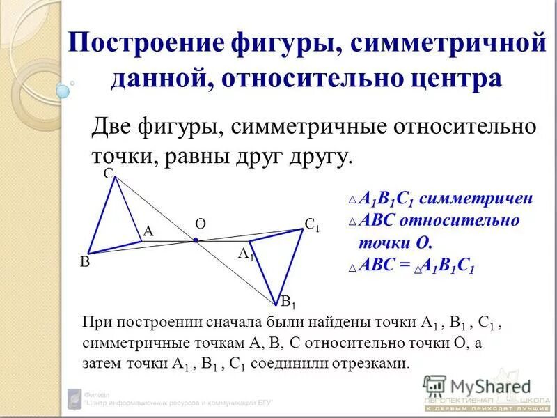 Постройте фигуру симметричную данной относительно точки о