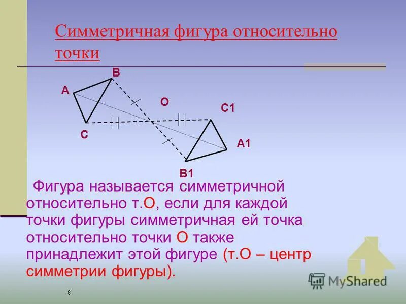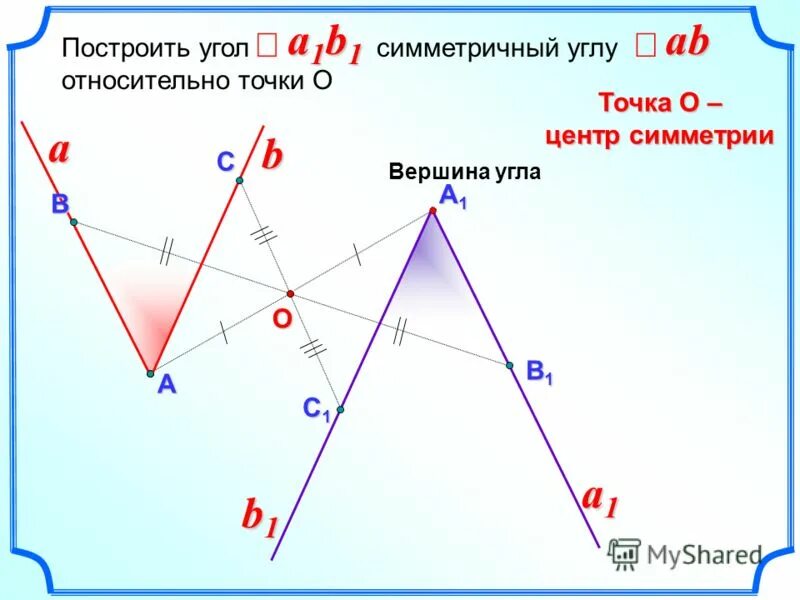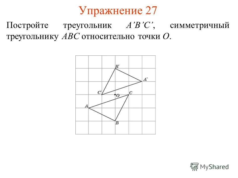 Постройте фигуру симметричную данной относительно точки о.
