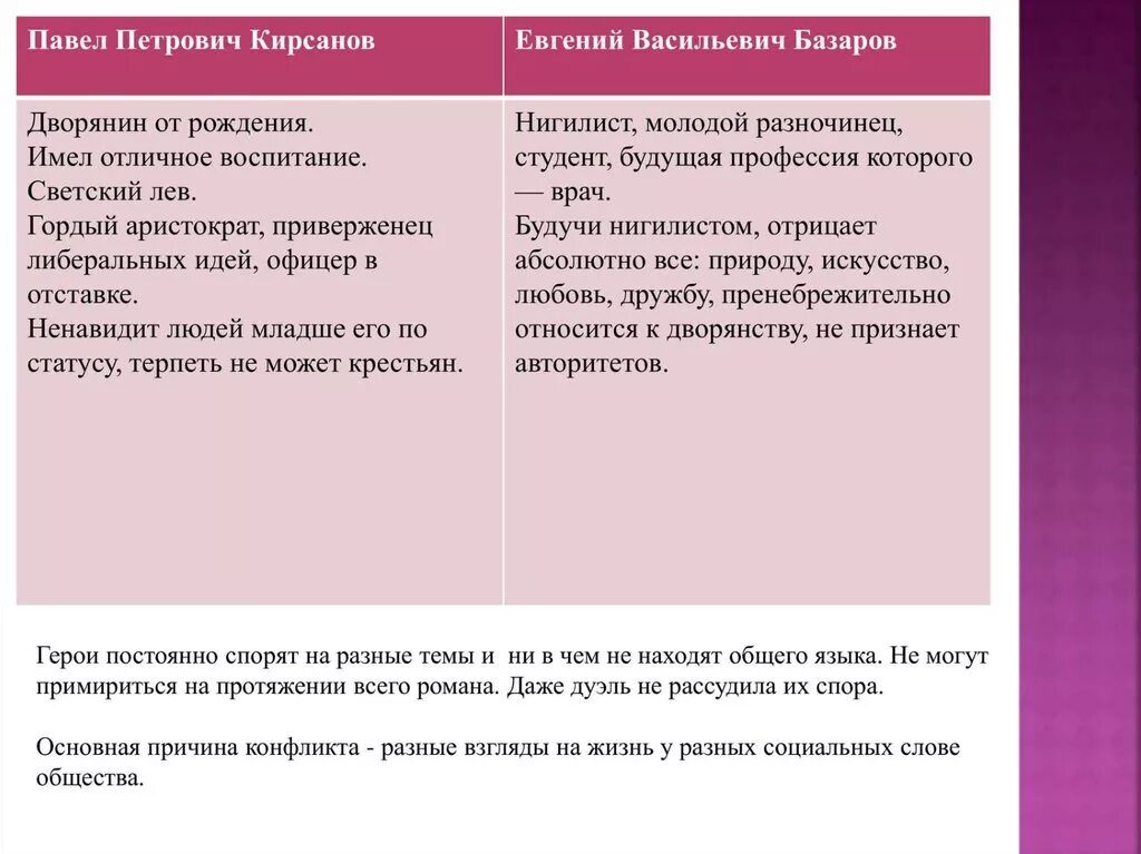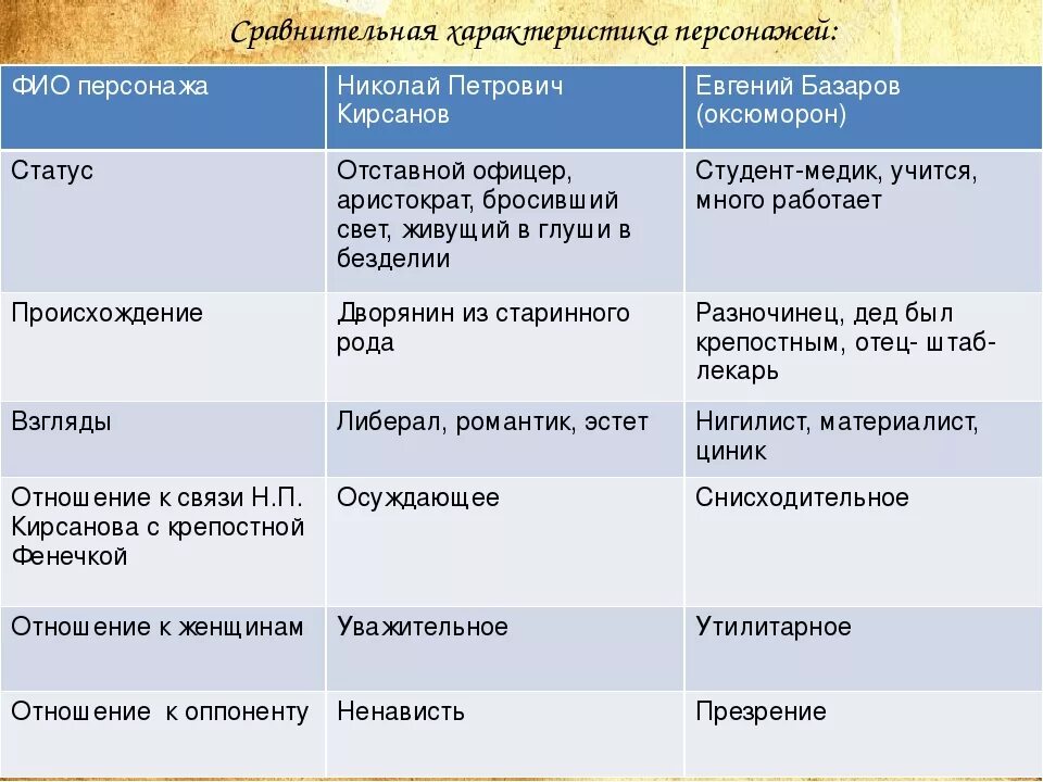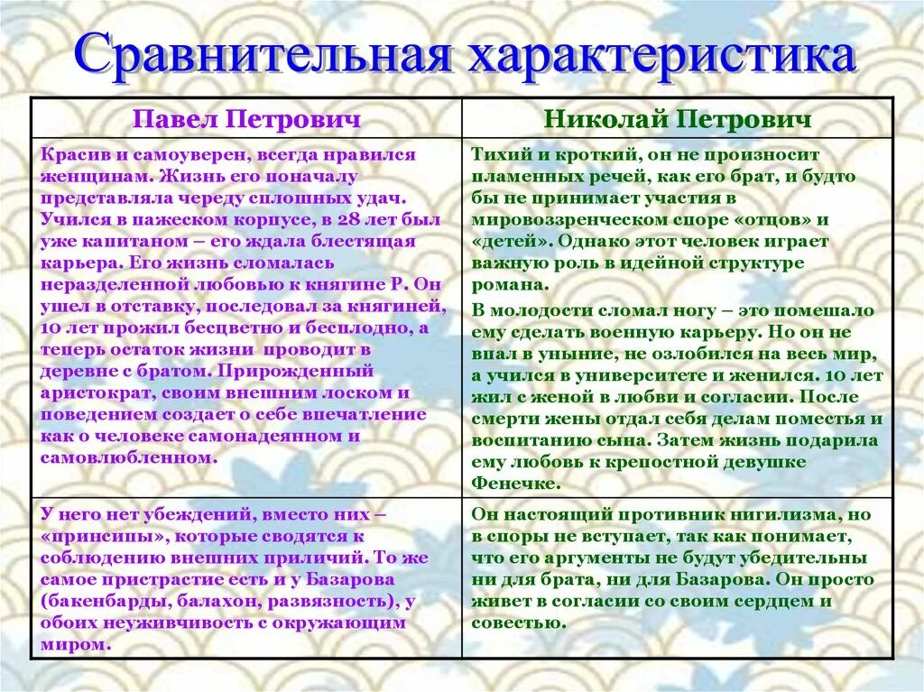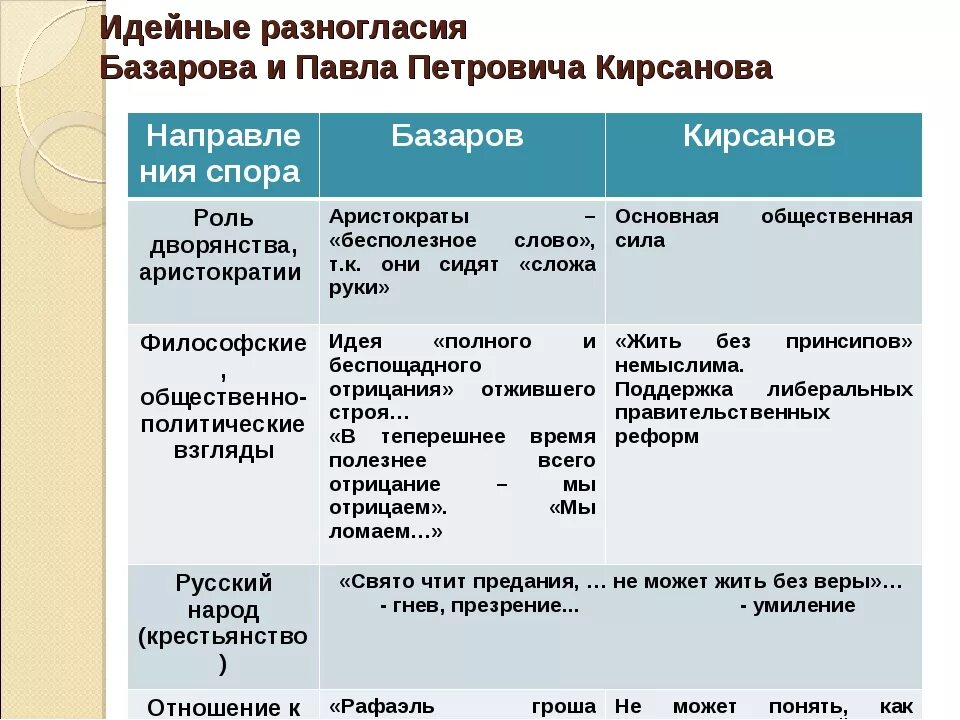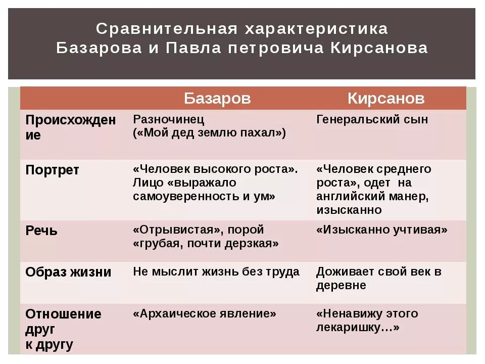 Воспитание и образование Базарова и Павла Петровича таблица.