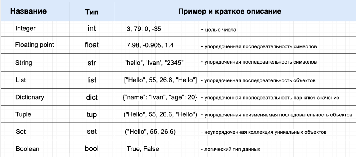 Типы данных питон таблица.