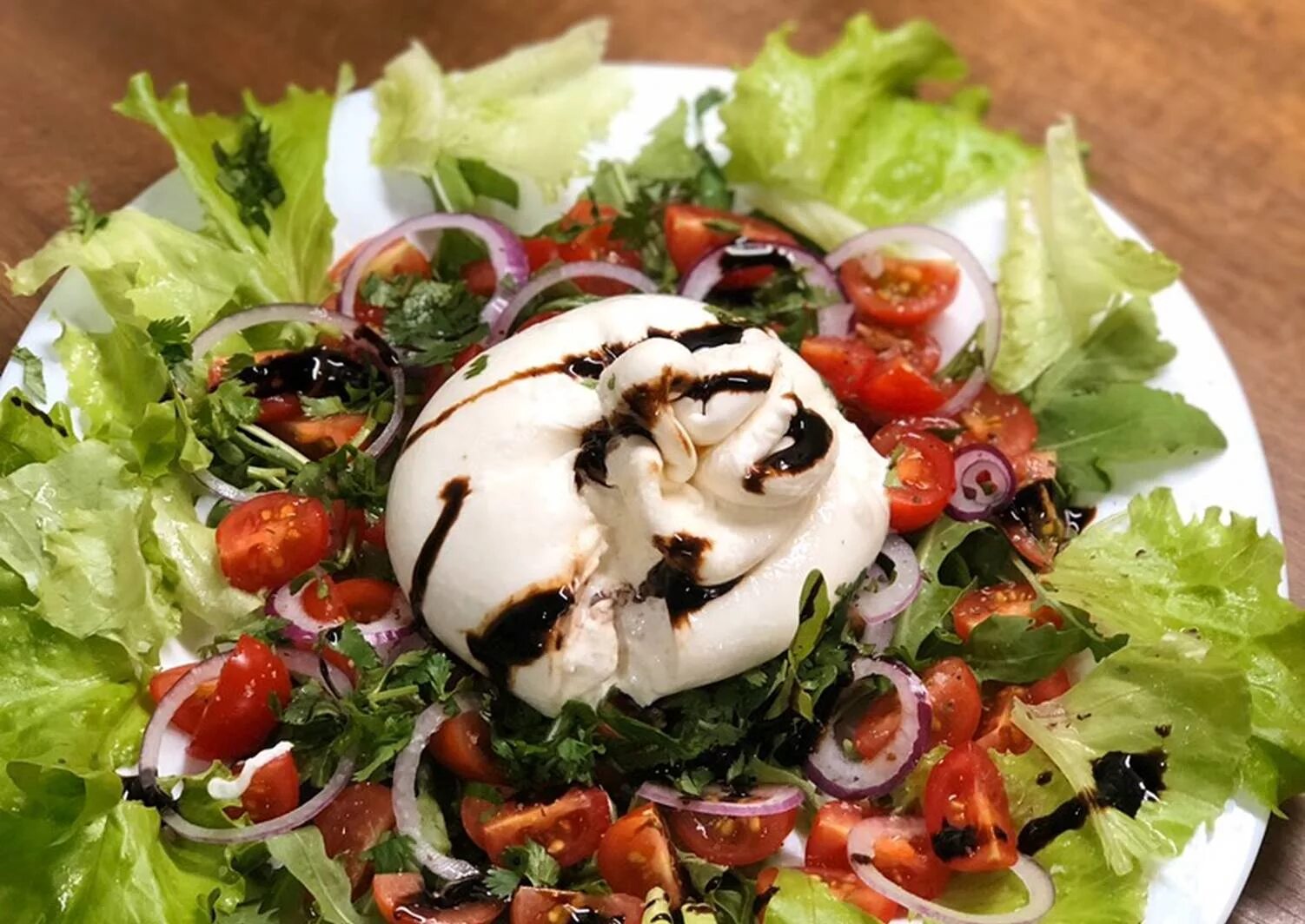 Салат с моцареллой и помидорами.