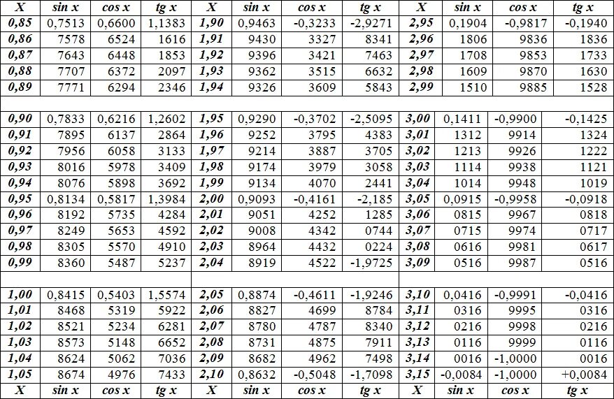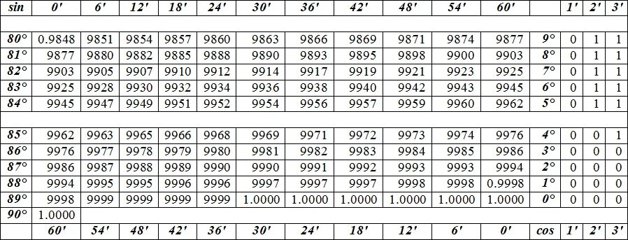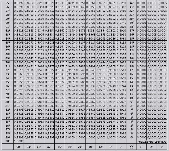 Таблица значений синусов и косинусов.