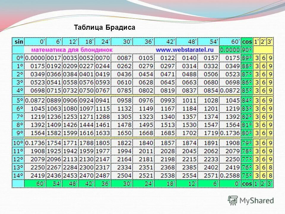 Синус 60 градусов равен таблица Брадиса.