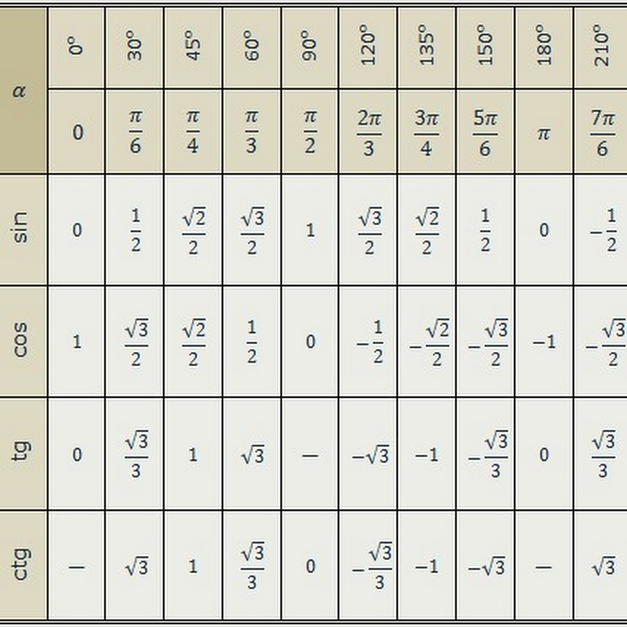 Таблица тригонометрических значений углов.