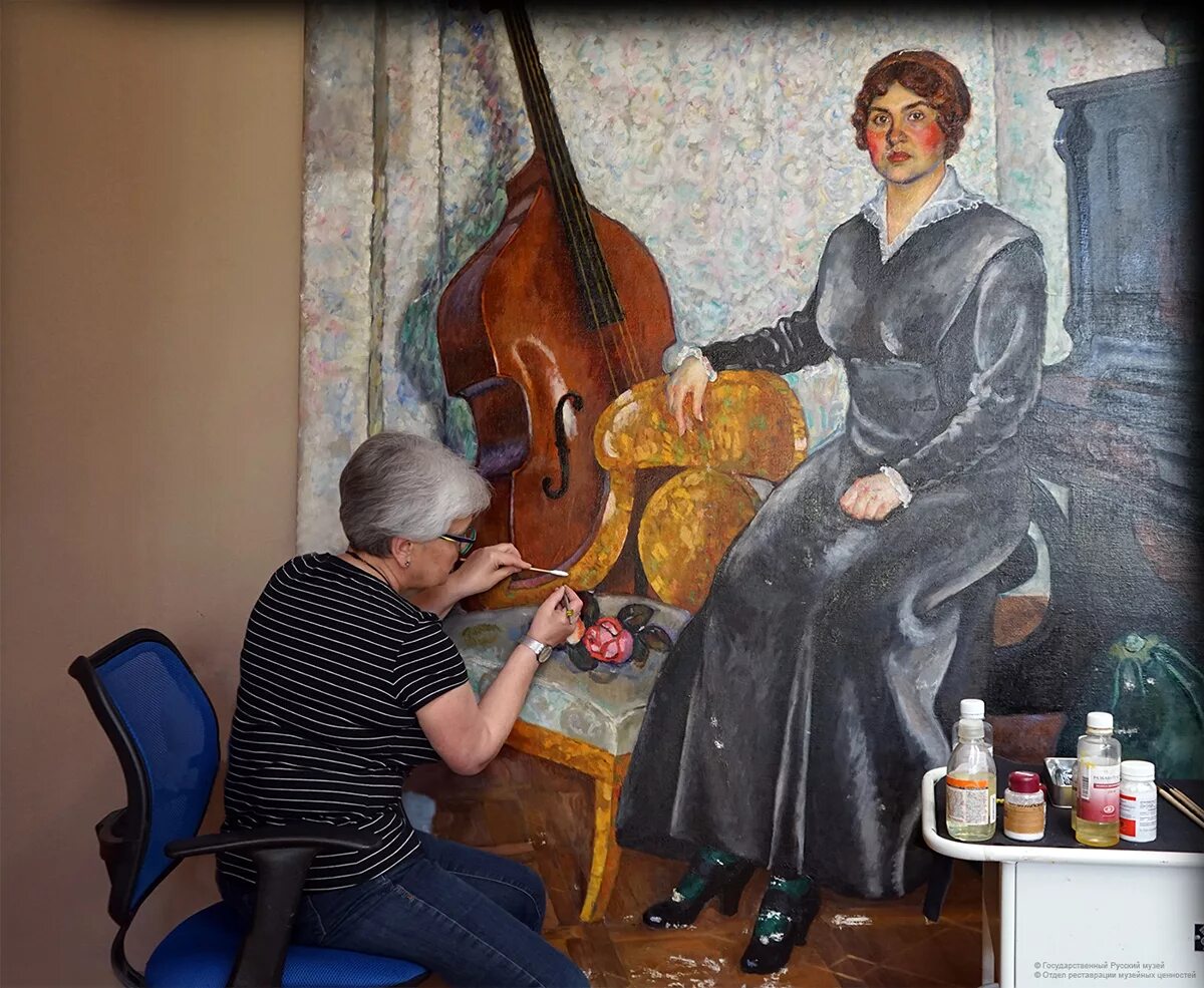 Девушка вешает картину.
