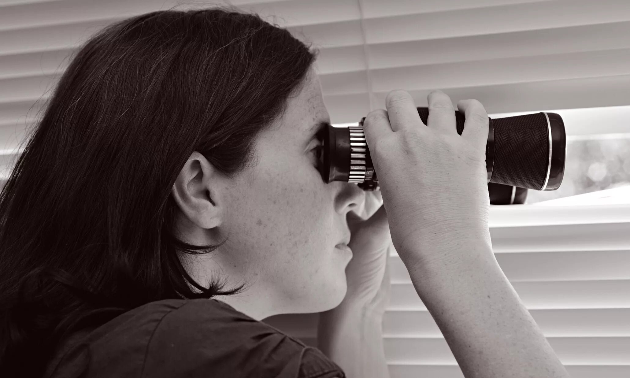 Женщина с биноклем у окна.