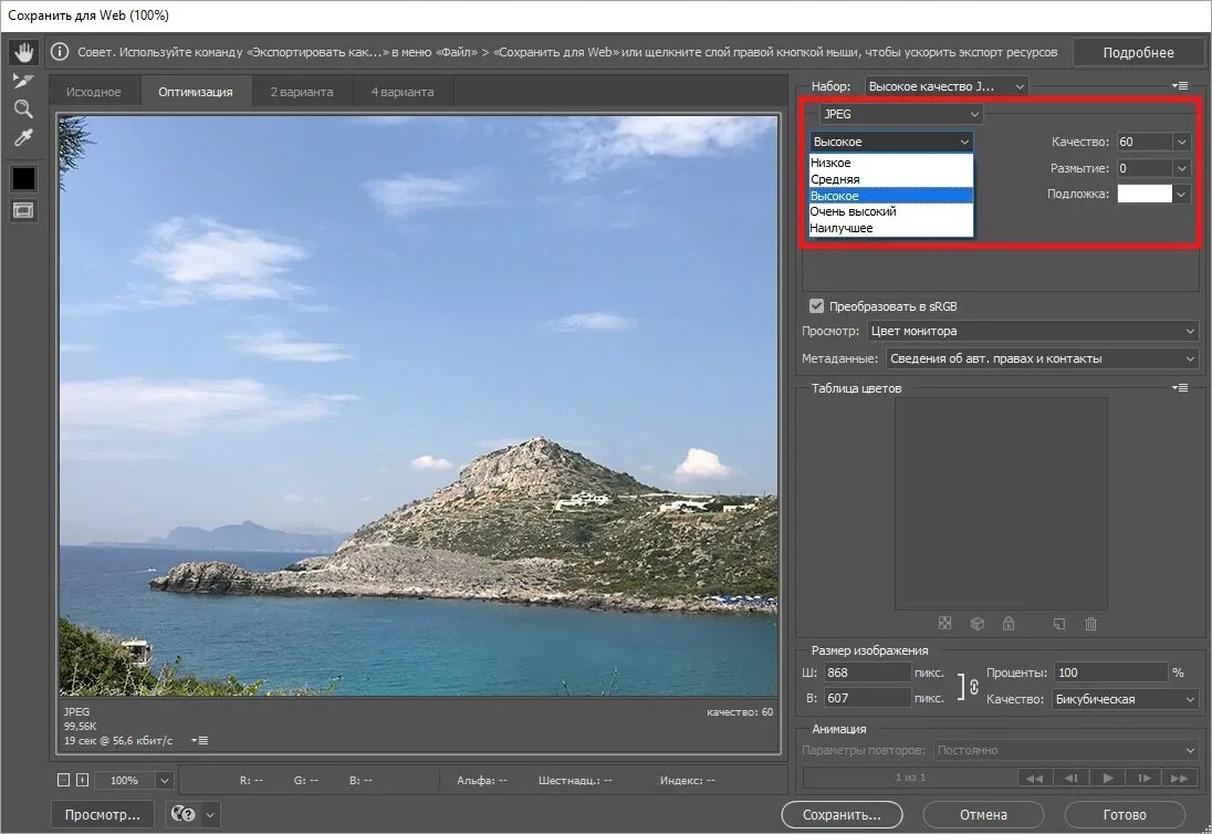 Параметры сжатия фотографий.