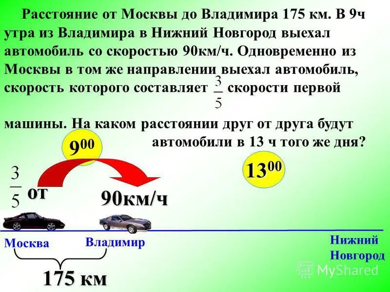 От Москвы до Владимира 175 км в 9 часов утра из Владимира.