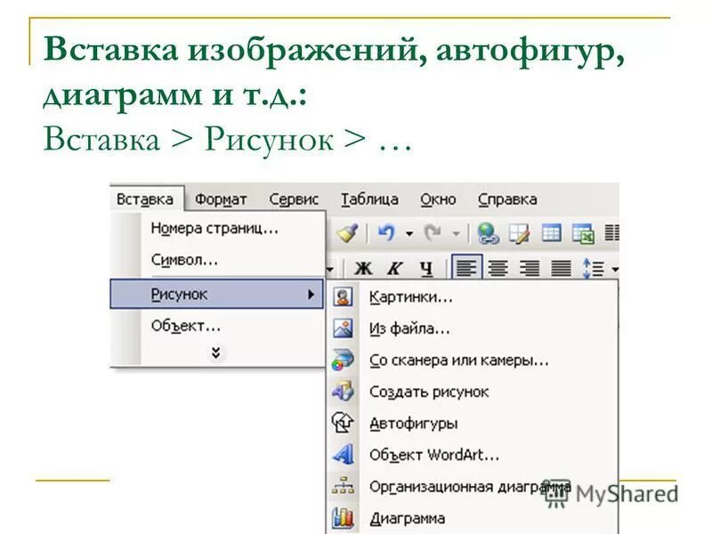 Вставка графических изображений в документ.